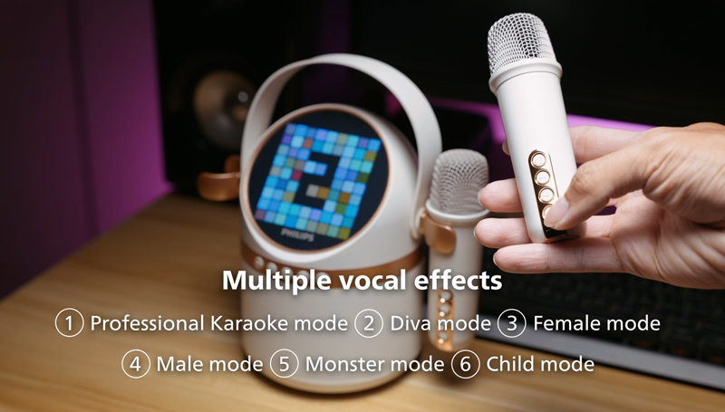 Join in and change the sound of your vocals. The two wireless karaoke mics let you add 6 fun effects to your voice at the touch of a button. Choose between diva voice, female voice, male voice, child voice, monster voice and even professional mode!