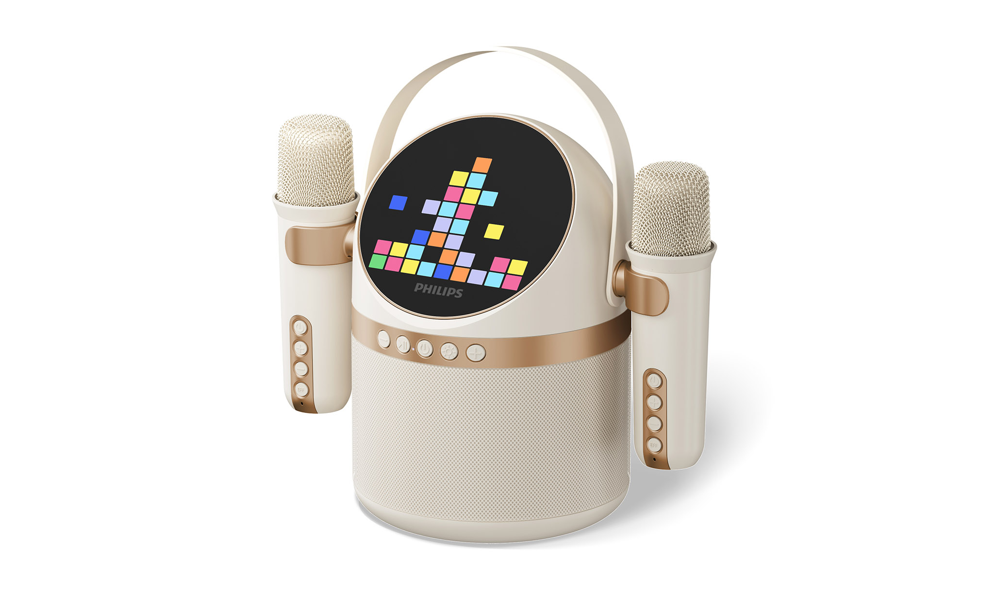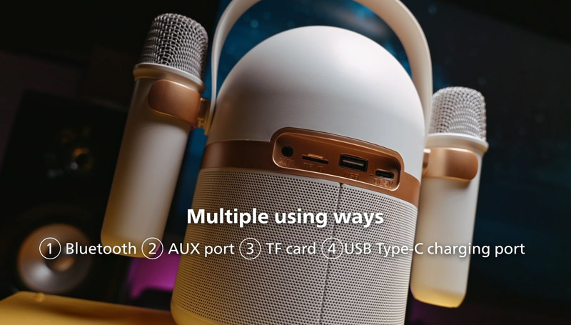 This Bluetooth speaker lets you sing to your tunes. Two wireless karaoke mics let you join in, dropping the vocals so you can accompany your music and even add fun effects like echo. Sing along with friends and make your music even more exciting!