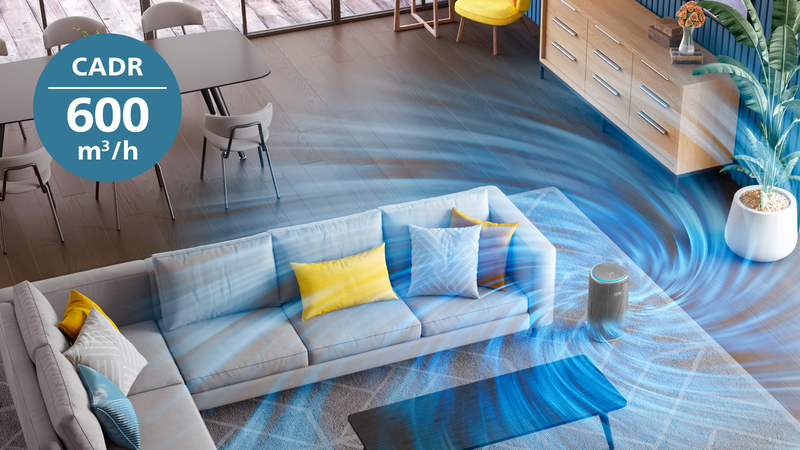 Up to 1.5 x more powerful than products of its size (1), thanks to its innovative double-fan design. With powerful filtration of 600 m3/h (CADR), it can easily handle large spaces of up to 156 m2 (2) and can clean a room of 20 m2 in less than 5 minutes (3).