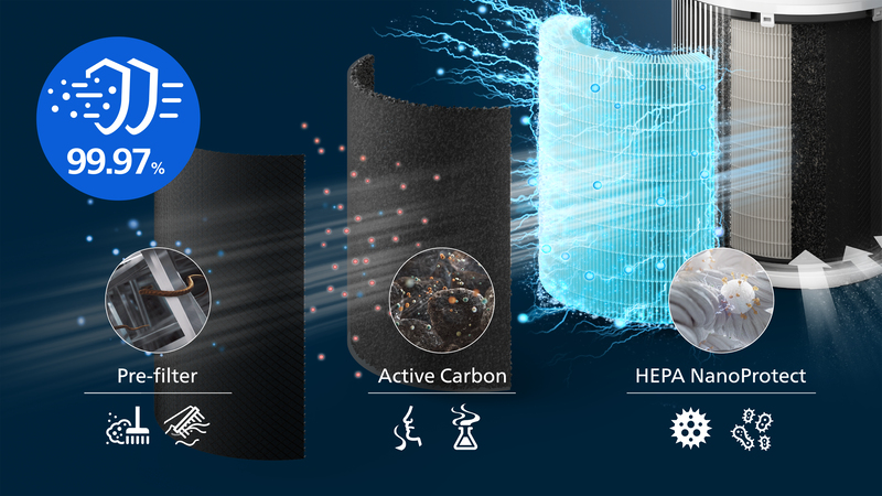3 layer filtration made of a pre-filter, HEPA NanoProtect and Active Carbon captures 99.97% of particles as small as 0.003 microns(4) — smaller than the smallest known virus!