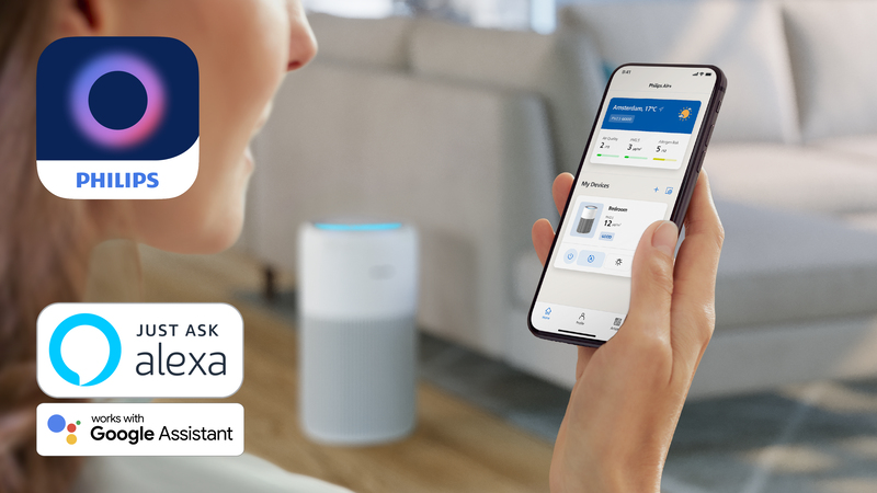 Pair the air purifier with the Air+ app for indoor and outdoor air quality monitoring, remote control and voice commands via Google and Alexa. In the app, select Auto+ mode for AI technology that adapts to your routine while minimising noise and energy use.