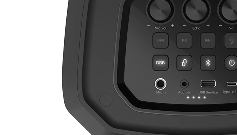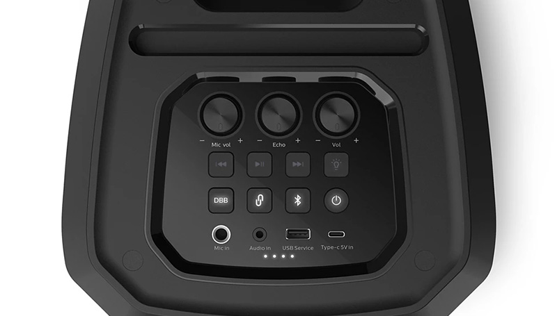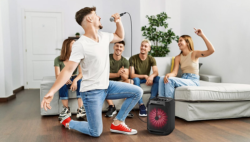 Be your party's music! The speaker features a 6.3 mm port so you can plug in a microphone and let the karaoke loose. Use the knobs to set your microphone volume and choose how much echo you think your singing needs.