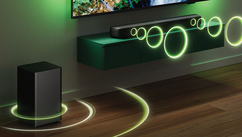 Enjoy a front-row seat to all the dramas you watch and play. This Dolby Digital Pluscompatible soundbar gives you a surroundsound experience without the need for extra speakers. You'll hear, and feel, the difference.