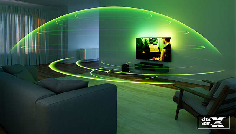 Compatibility with DTS Virtual:X transforms your TV sound, bringing you a virtual 3D sound experience no matter what's on screen! You don't need extra speakers, and it works in any room: turn it on via the soundbar's remote control, or the Philips Home Entertainment app.