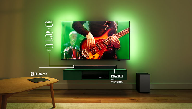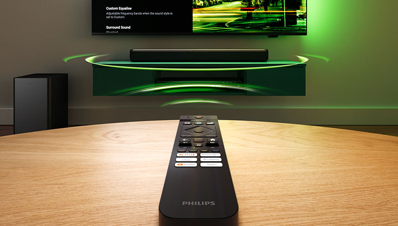 You can adjust the volume on your soundbar using your TV remote. If you have a Philips Ambilight TV, the EasyLINK function lets you use the remote to switch between the soundbar's preset EQ modes, adjust bass and treble—and more.