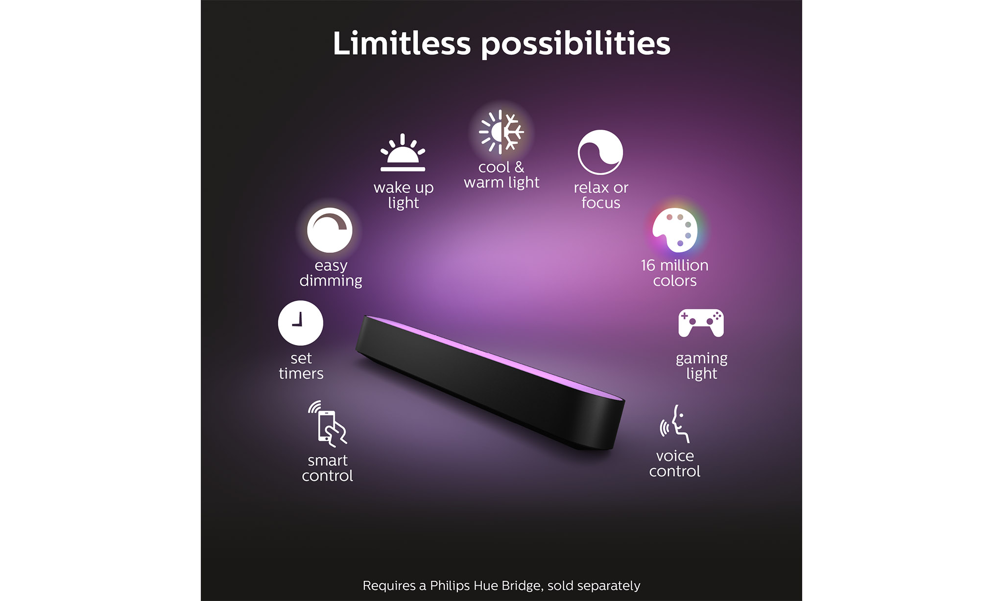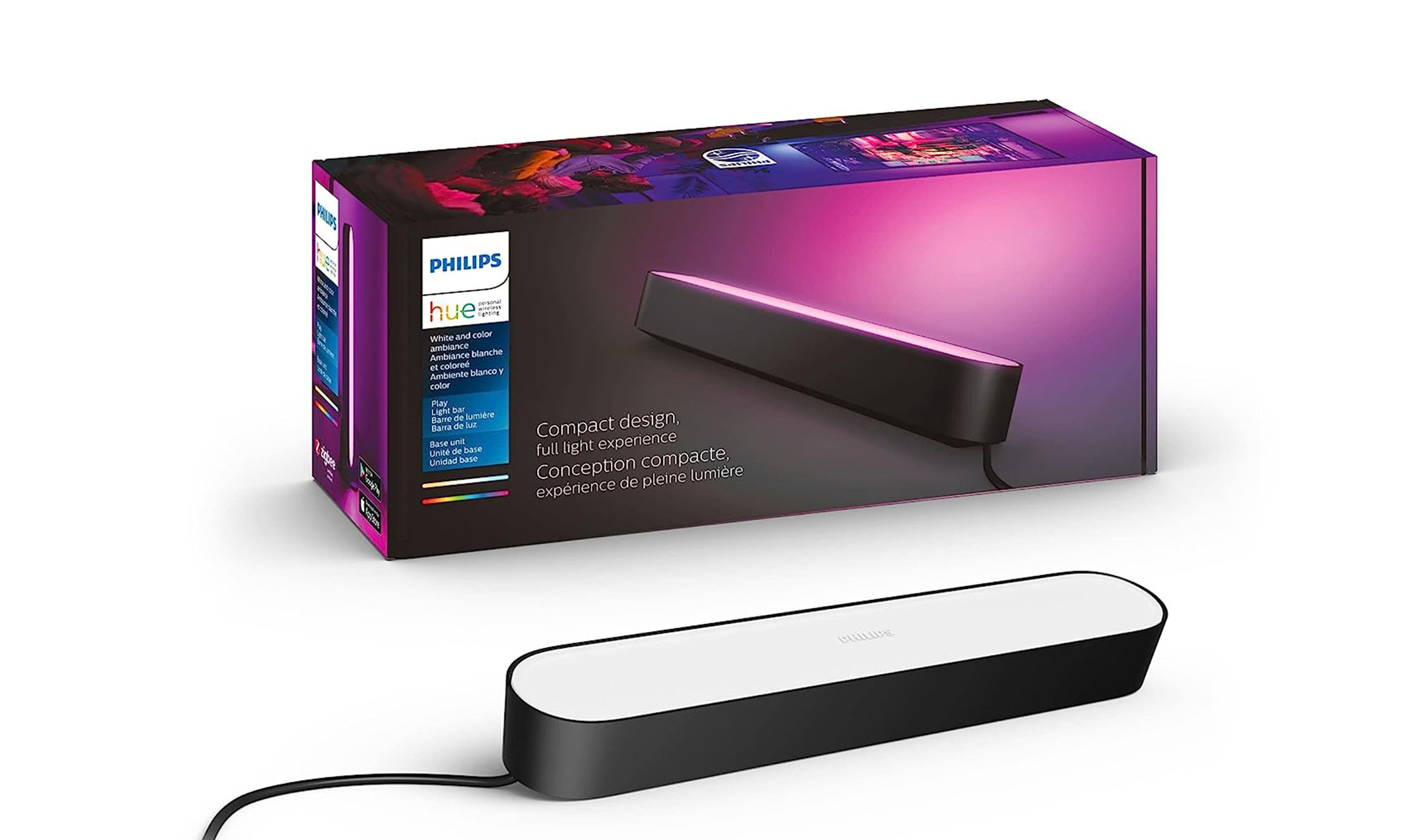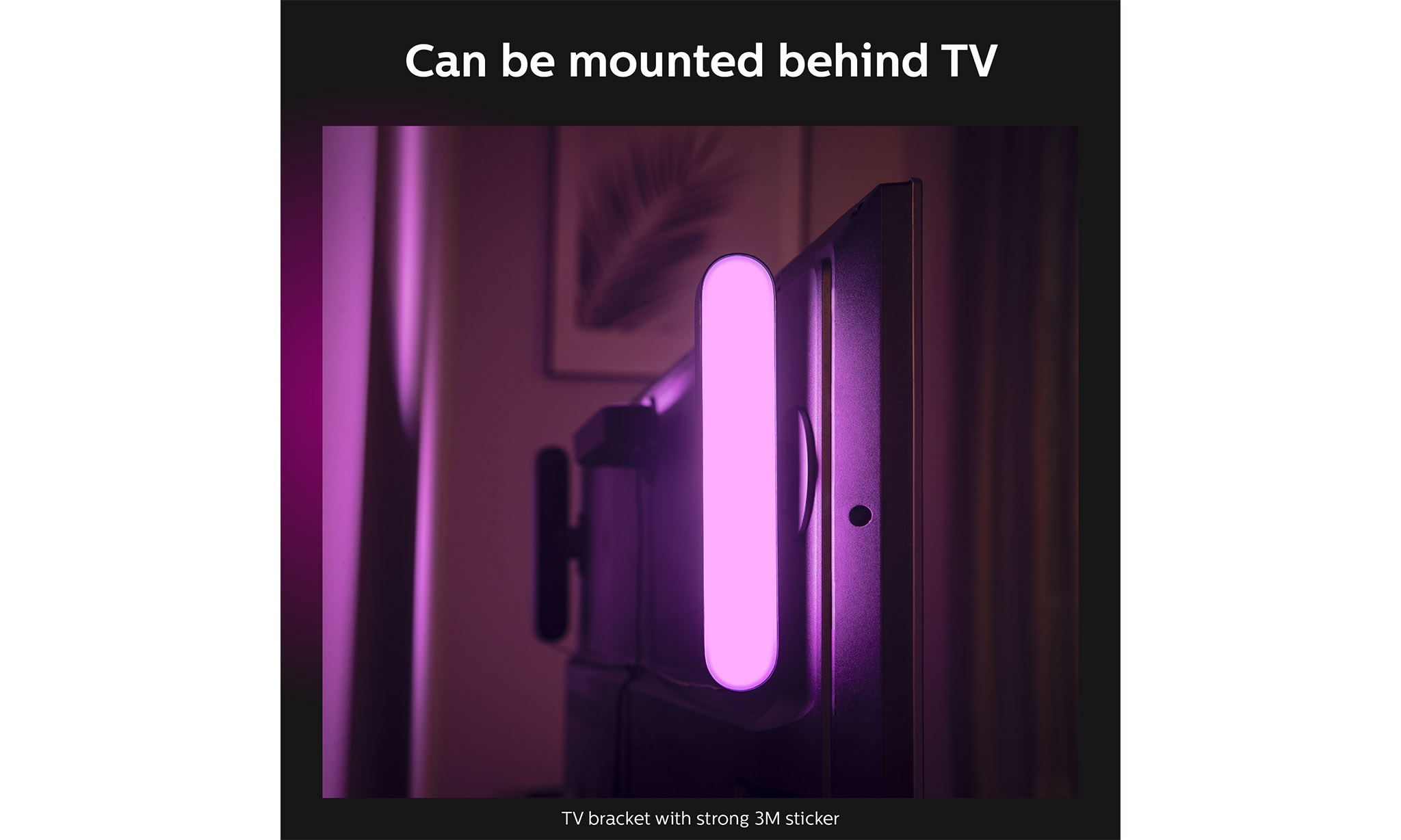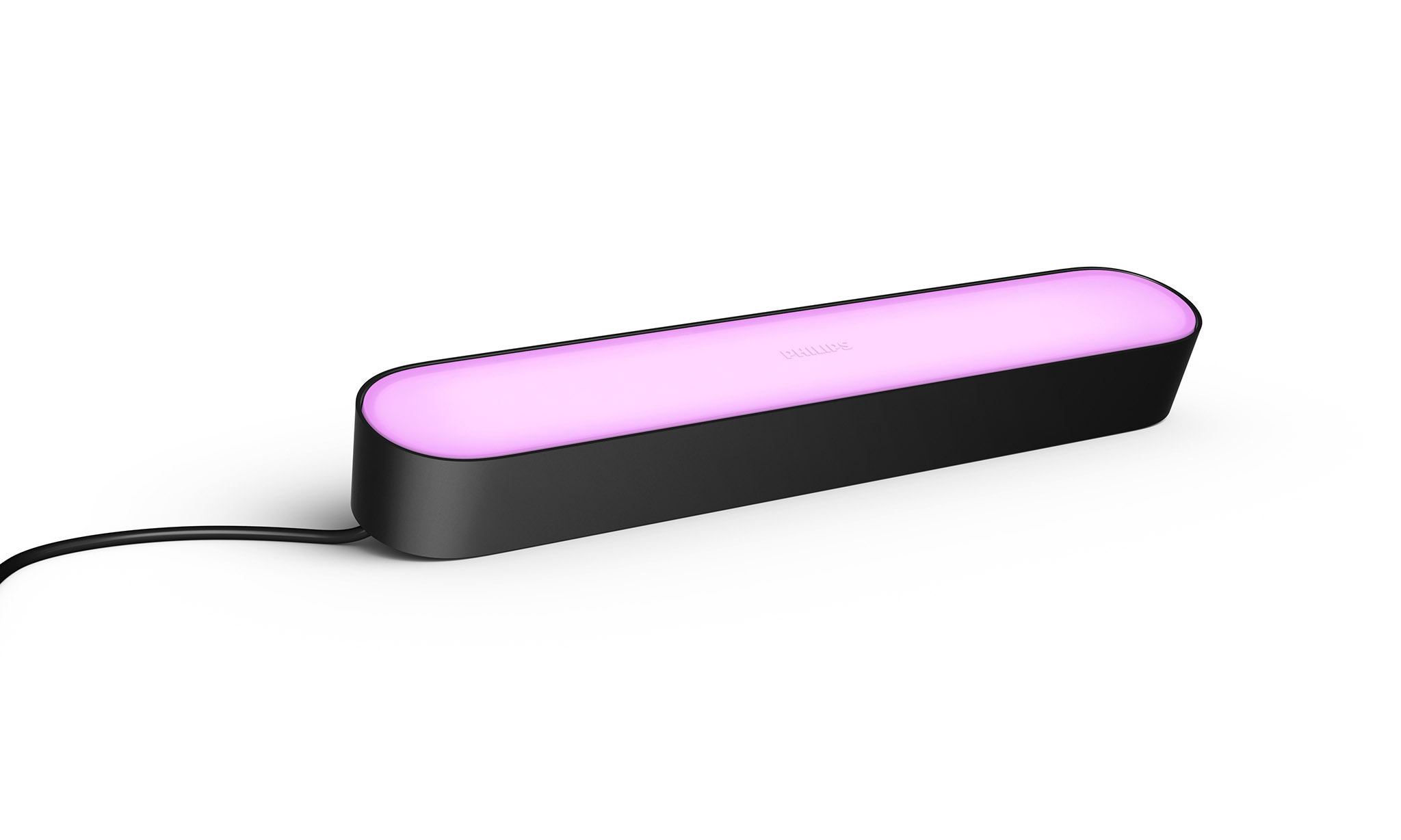 Create a wash of colorful smart light with the sleek design of the Play light bar in black. This Play light bar, which includes a power supply that can connect up to three light bars, can be stood upright, laid horizontally or placed on to the back of your TV with the included mounts.