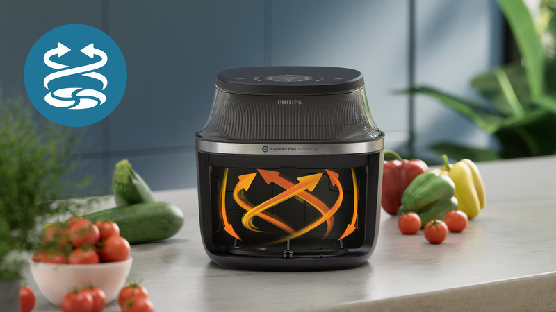 Enjoy delicious food with up to 90% less fat*. Patented RapidAir Plus Technology with unique star-shaped design circulates hot air around and through the food with faster airflow**, ensuring even cooking inside and outside to create tasty homemade meals.
