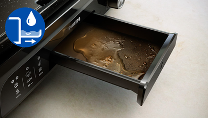 Fat melts away and is collected in the removable drip tray.