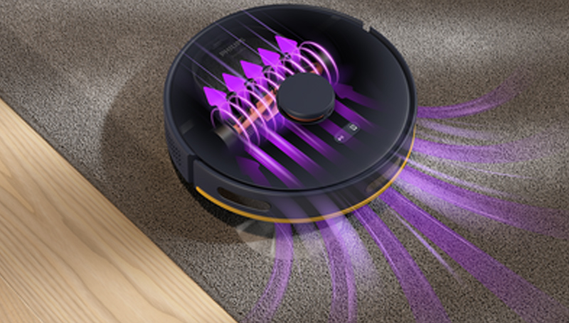 The robot automatically boosts suction power when it has driven onto a carpet or rug to capture fine dust particles hidden deep inside the carpet*.