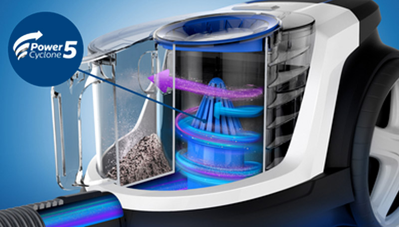 PowerCyclone 5 technology accelerates the air flow in the cylindrical chamber to separate dust from the air and maintain high performance and strong suction power for longer