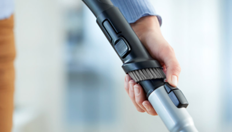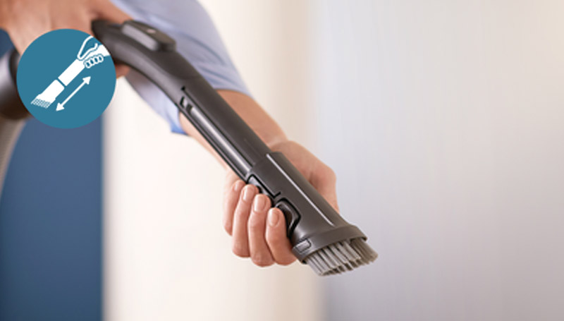 Dusting brush tool is built into the handle so it's always ready to use on furniture, flat surfaces and upholstery