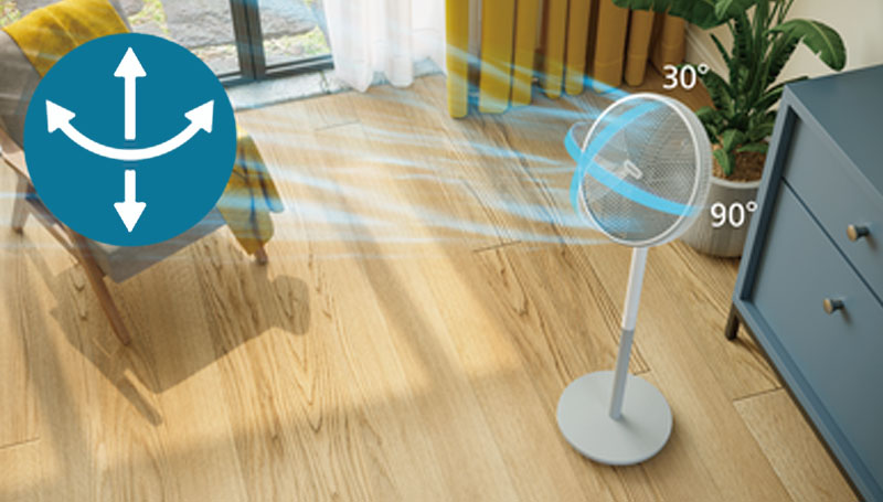Feel the cooling breeze in every corner. Our fan can be tilted 30 degrees and rotates 90 degrees automatically, ensuring even airflow throughout the whole room.