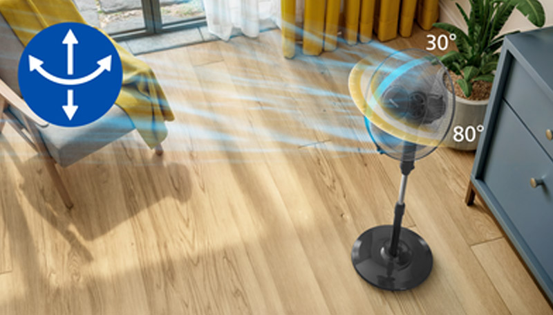Feel the cooling breeze in every corner. Our fan can be tilted 30 degrees and rotates 80 degrees automatically, ensuring even airflow throughout the whole room.