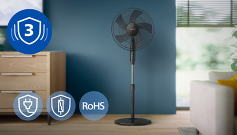 This fan is built with safety in mind, featuring a thermal fuse, certified plug and RoHS standards. The thermal fuse cuts power if the motor overheats, while the certified plug ensures secure operation. RoHS limits the use of harmful materials, making this fan a safer choice for you and the environment.