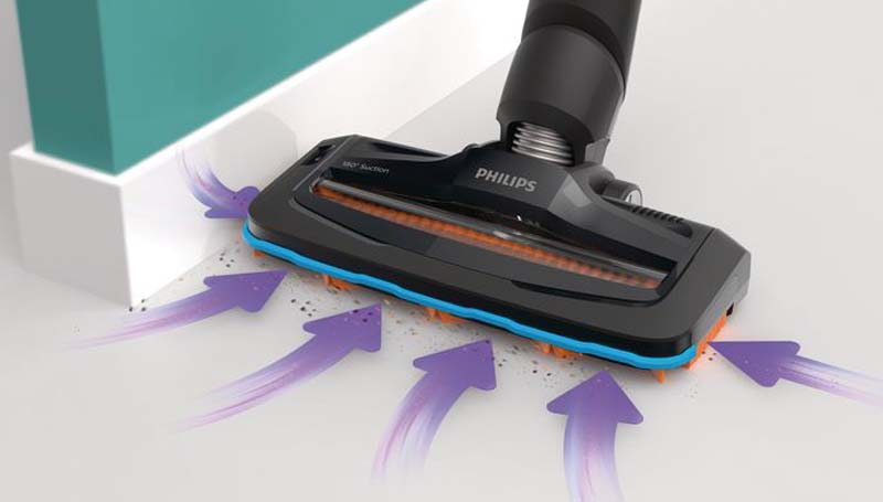 180° suction nozzle is designed for precise and powerful pick-up of up to 98% of dust and dirt in each stroke, on all floor types, even in those hard to reach spots.