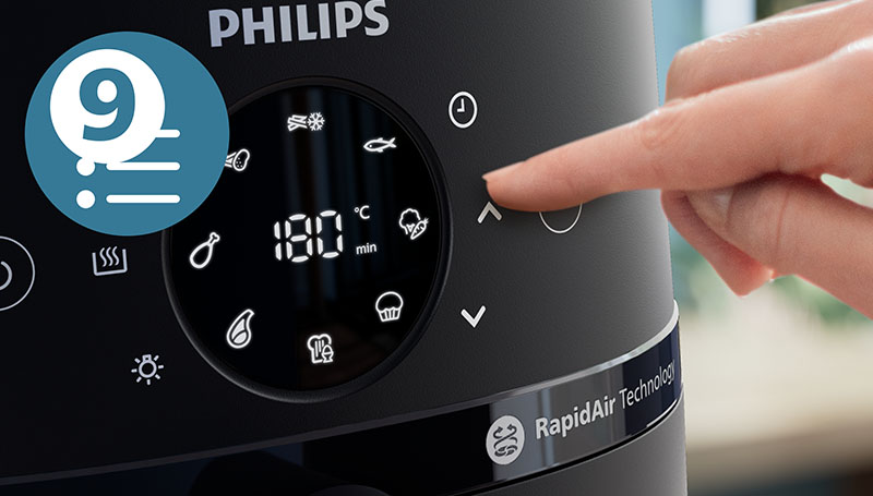 Easy-to-use touchscreen has 9 preset functions to choose from: frozen fries, fresh fries, chicken drumsticks, meat, fish, breakfast, vegetables, cake and keep warm.