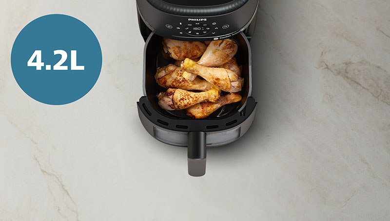 The compact design is ideal for every kitchen large or small. Holds up to 500 g of fries, 6 chicken drumsticks or 600 g of vegetables in a 4.2-liter pan.