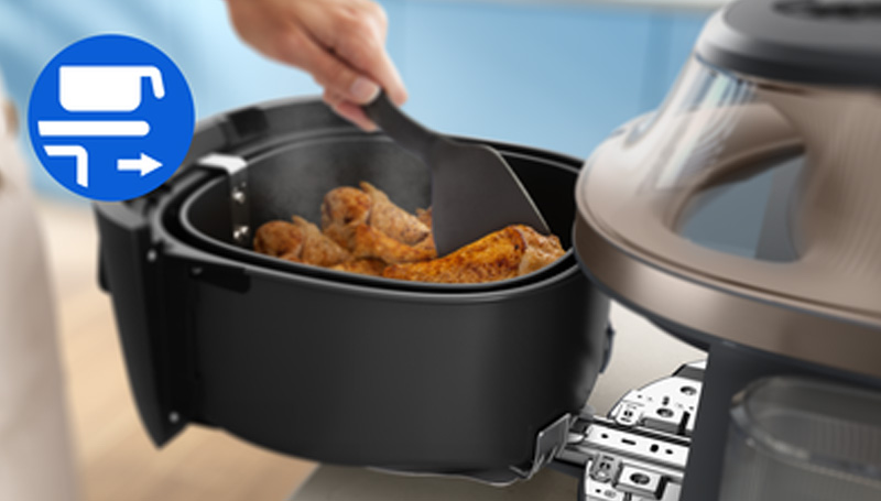 Whether you only have one hand free or need quick access while cooking, our patented EasySlide Rail technology******* makes checking, shaking, or adding ingredients easier than ever. Designed for ultimate convenience and safety, the sliding mechanism glides smoothly and securely, ensuring the basket stays upright and stable on its tracks at all times. Compared to placing the hot basket on your countertops, it will reduce the risk of burns, creating a safer and more seamless cooking experience.
