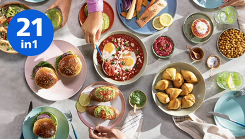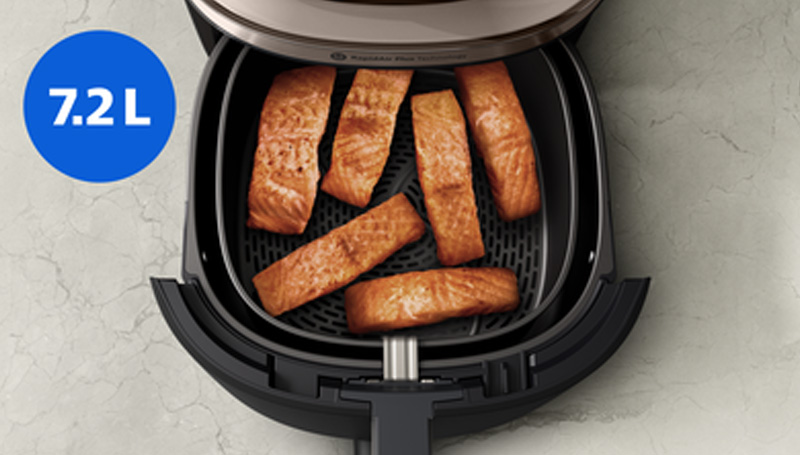 Cooks up to 1.4kg of veggies, 10 drumsticks, 6 salmon llets, or 9 muffins.