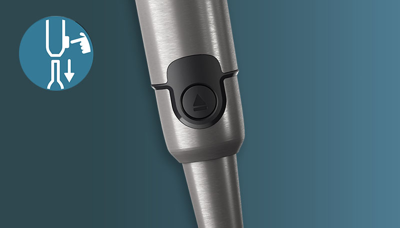 A one-touch button releases the blending bar with one hand. So you can change attachments without putting down the blender or making a mess on the counter.