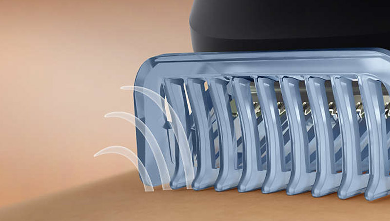 The advanced Lift and Trim comb lifts hairs towards the blade, capturing hairs with each pass for an efficient and even trim.