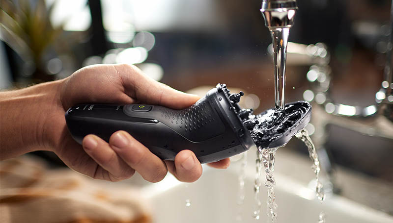 The shaver head flips open at the touch of a button to rinse clean under running water.