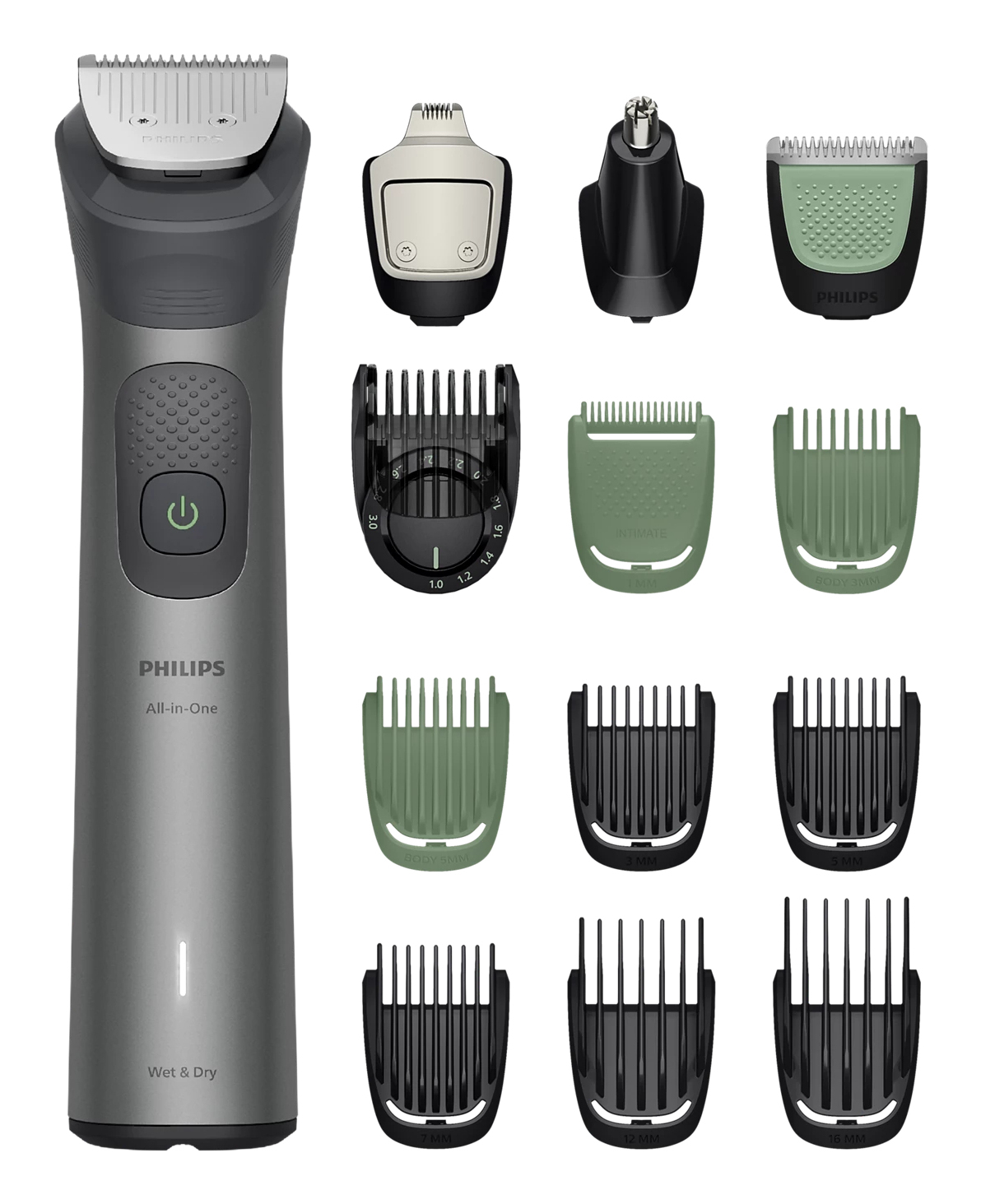 Our All-in-One trimmer offers the versatility and precision you need with 13 quality tools designed for face, head and body. Self-sharpening blades stay as sharp as day 1 and the premium precision comb helps achieve look and style you want.