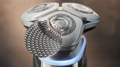 Fully flexible and smaller, compact heads with skin stretching patterns dynamically adapt to every curve of your face. For constant skin contact with 20% more precision* to catch difficult hairs on the neck and under the nose. Precision everywhere.