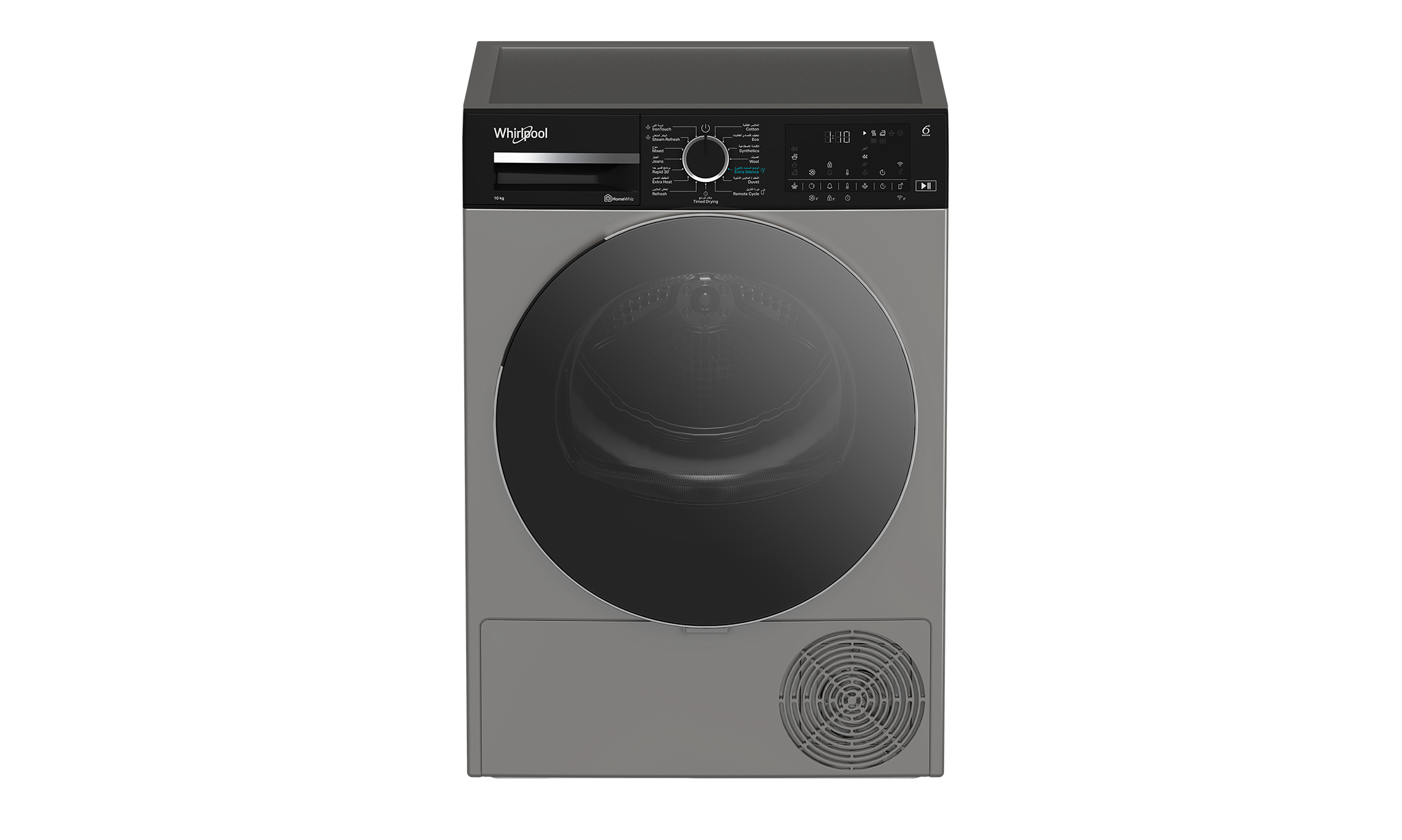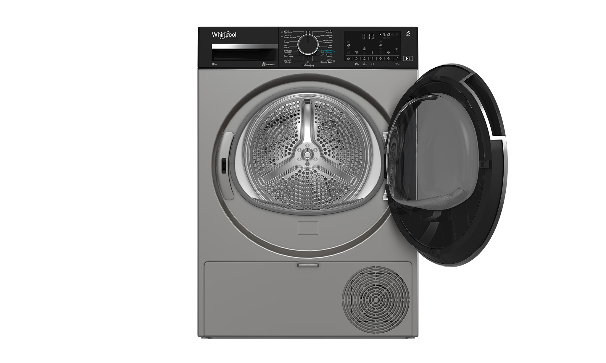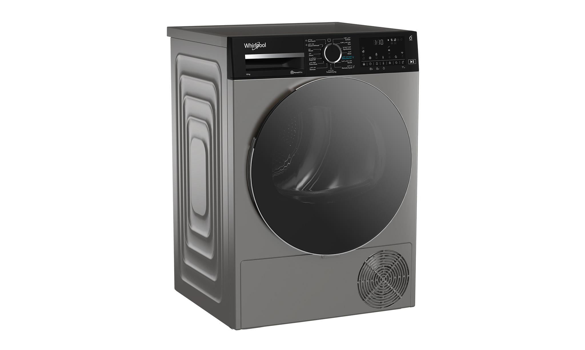 This Whirlpool freestanding Tumble Dryer features: silver color. Outstanding 10kg drum capacity, so you will never run out of space. Exclusive 6th SENSE technology that constantly monitors the moisture in the drum, protecting your clothes and providing ideal drying results. Heat pump technology that effectively re-heats the air in the appliance, significantly reducing energy consumption.
