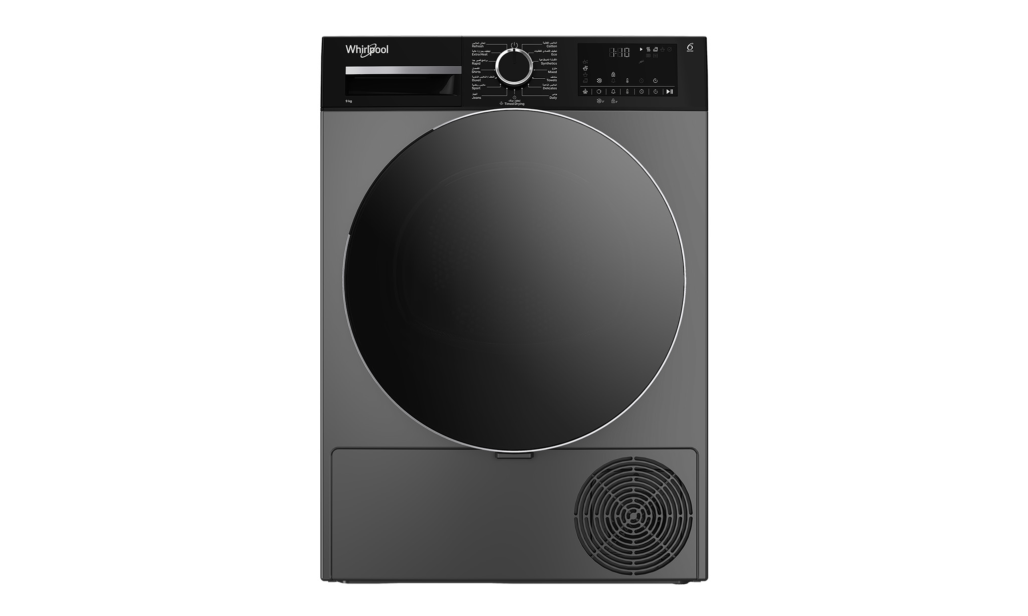 This Whirlpool freestanding Tumble Dryer features: silver color. Outstanding 9kg drum capacity, so you will never run out of space. Exclusive 6th SENSE technology that constantly monitors the moisture in the drum, protecting your clothes and providing ideal drying results. Heat pump technology that effectively re-heats the air in the appliance, significantly reducing energy consumption.
